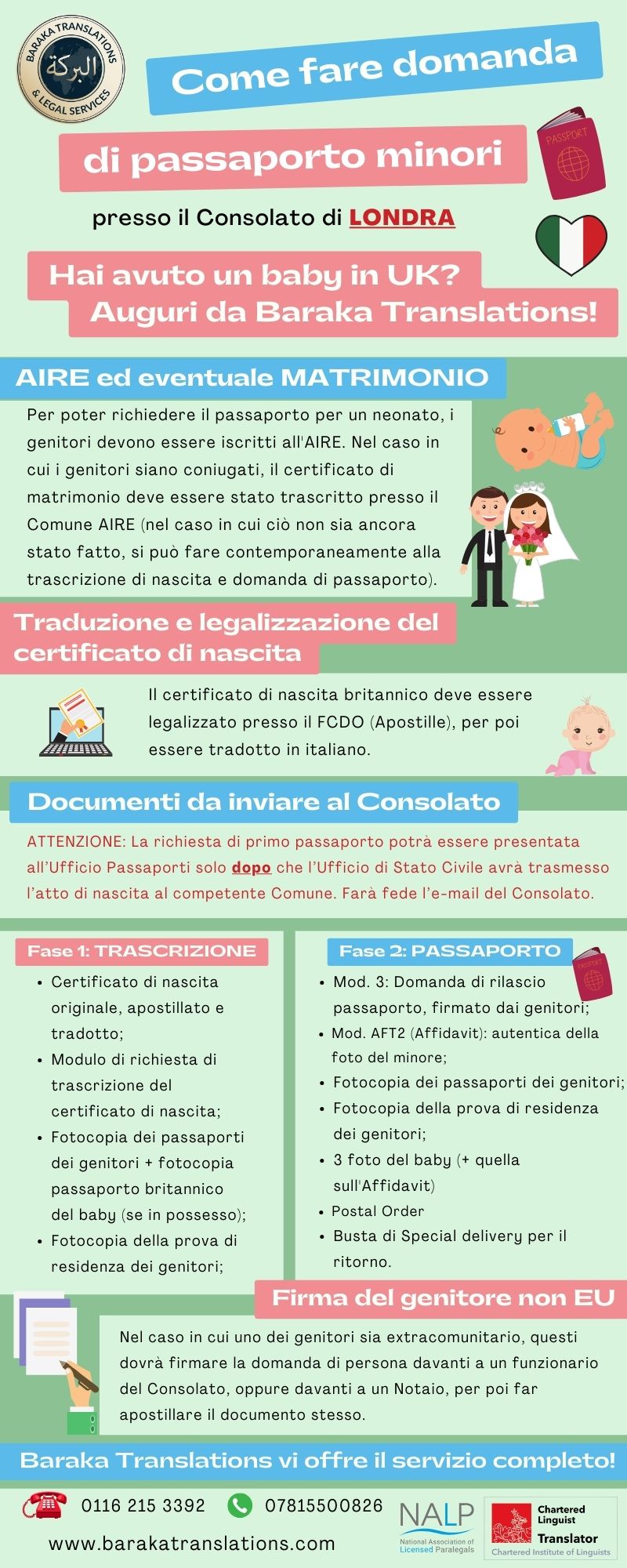 La nostra agenzia vi offre un servizio completo di compilazione dei documenti (trascrizione nascita / domanda passaporto / pagamento del Postal Order [per il Consolato di Londra] e invio della domanda al Consolato di Londra o Manchester). Il passaporto sarà recapitato al vostro indirizzo A.I.R.E.