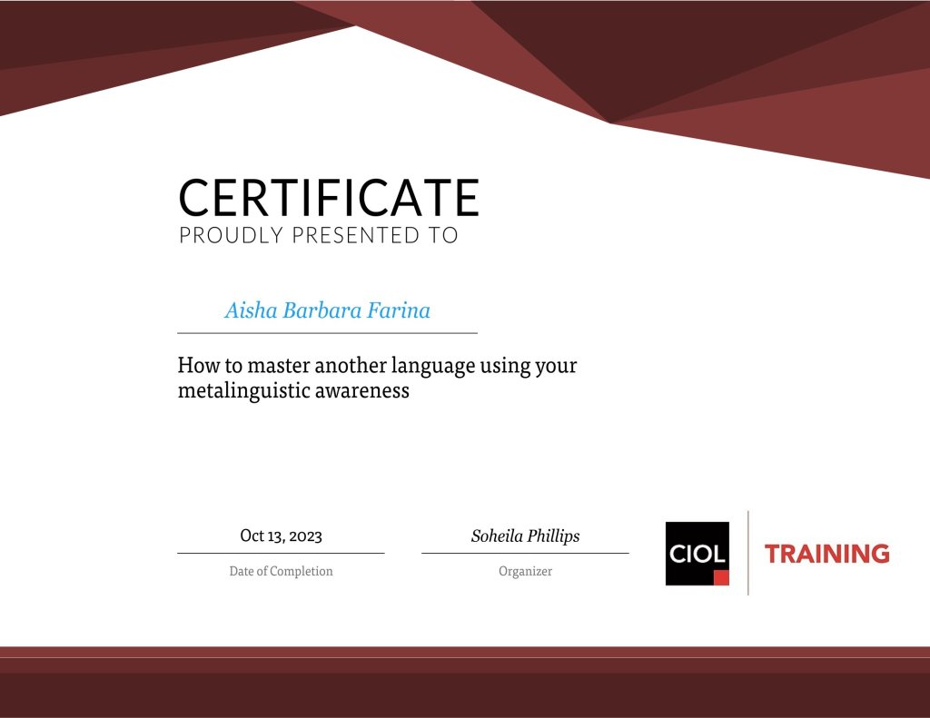 Aisha Barbara Farina, BSc (Hons), BAIS, MCIL