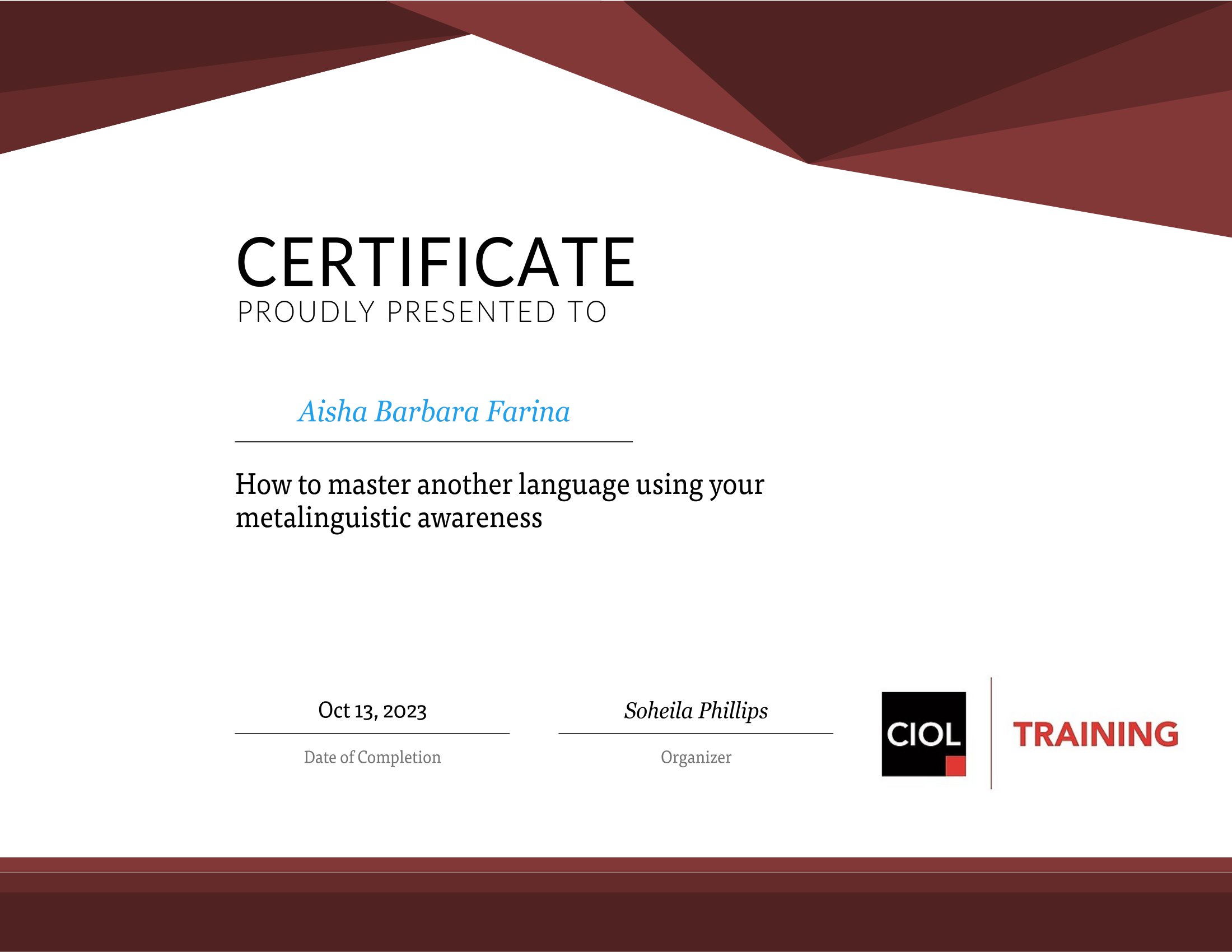 Aisha Barbara Farina, BSc (Hons), BAIS, MCIL