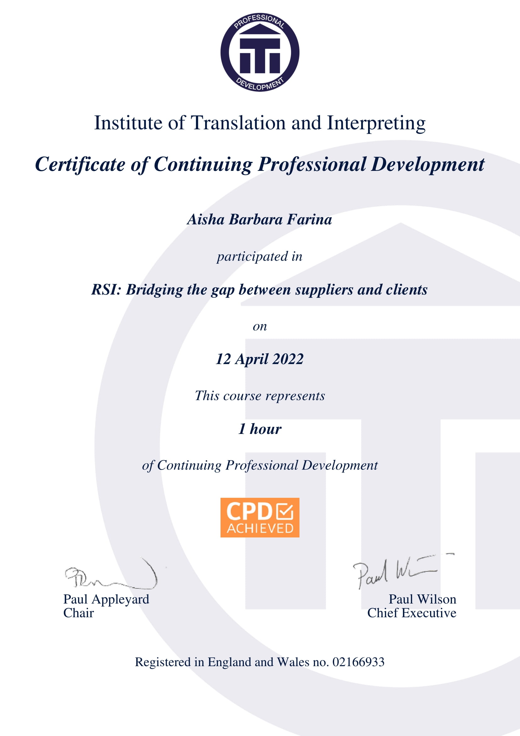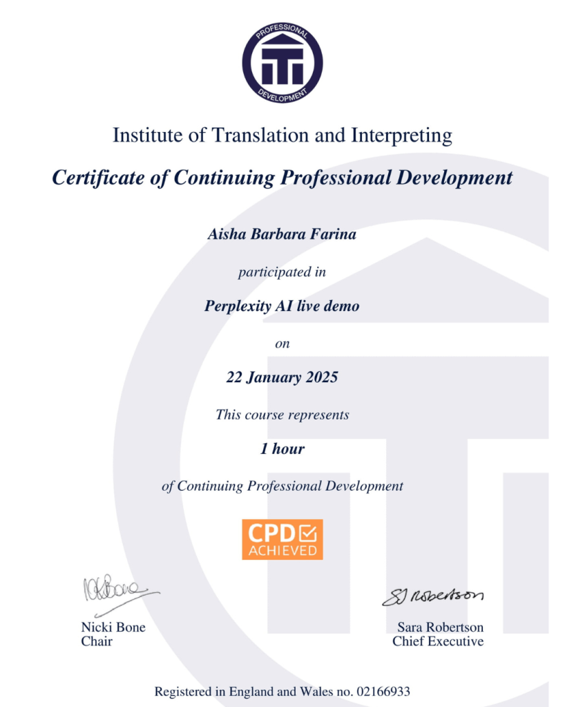 Aisha Barbara Farina, BSc (Hons), BAIS, MCIL